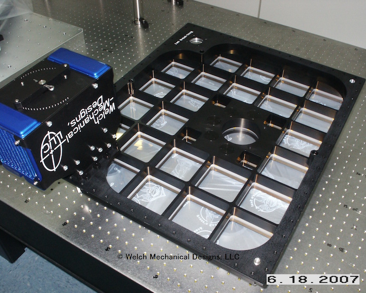This 23" x 20" telescope assembly is mounted on the underside of an aircraft. The 5 receiver apertures allow lidar collection at multiple angles far from Nadir.