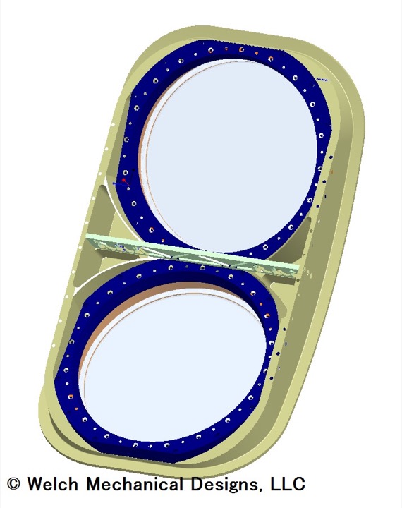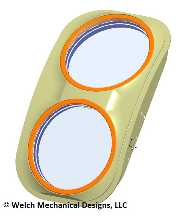The SCIFLI Window assembly is composed of a large window assembly frame that is custom-fit to the existing opening in the aircraft, two o-ring seals, two-piece window cells, and two 15.9-inch (40.37-cm) optical quality windows. Both windows are easily removed for post flight inspections and come with o-ring sealed replacement plugs for use in transit flights. The entire assembly is designed to install with no modifications to the aircraft, which allows the original observation windows to be re-installed as necessary. The SCIFLI Window assembly and window replacement plugs were designed to operate within the normal pressure, vibration, thermal and structural operating limits of the HU-25 aircraft. Performance was confirmed by extensive finite element analysis.