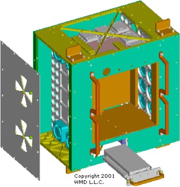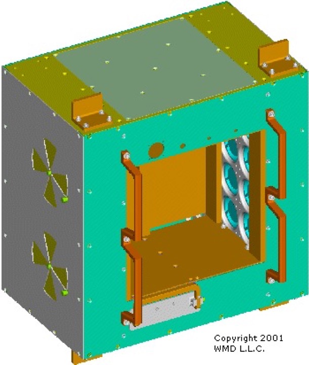 Similar boxes had problems with condensation forming on their electronic components: the electronics cooled to below freezing when the ER-2 flew at a 65,000-ft (19.8-km) altitude, and water condensed on the electronics as the aircraft descended to a warmer and more humid altitude. To address these problems, we designed a sealed enclosure with twelve fans that continuously circulated air inside. This evenly distributed heat from the electronics to other areas. Hot spots were cooled and the system stayed warm enough to prevent condensation.