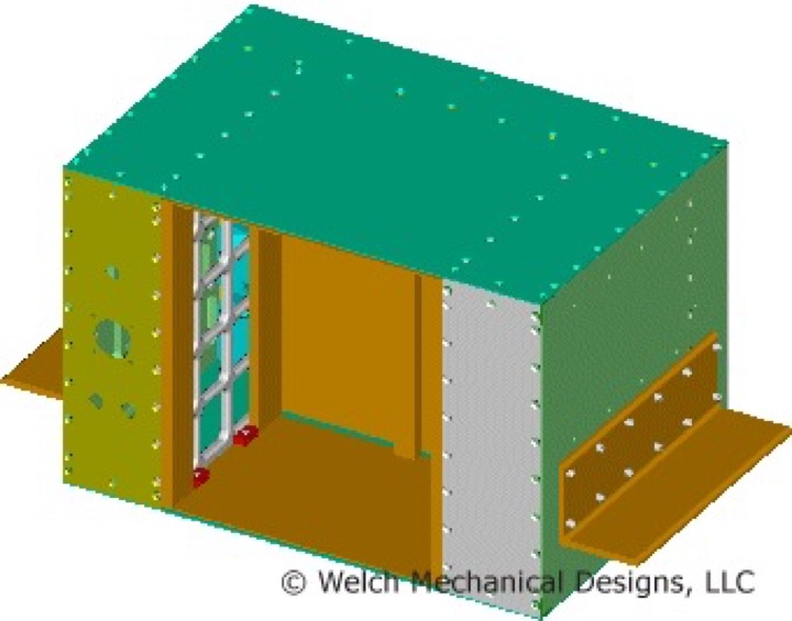 The old design had an outer skin that was bolted to hard points in the nose of the ER-2. The electronics were then slid into and bolted to the outer skin. The new design shown is built around a standard off the shelf card rack (shown in orange in the middle of the enclosure). The main body of the enclosure is 19.9 inches (50.5 cm) wide x 11.9 inches (30.2 cm) tall x 12.25 inches (31.1 cm) deep to approximately match the existing enclosure. The mounting "ears" on the side increase the overall width to 23.9 inches and these attach the enclosure to the mounting points in the ER-2 nose. This design allows all of the electronics to remain enclosed and gives easy access to the mounting points.