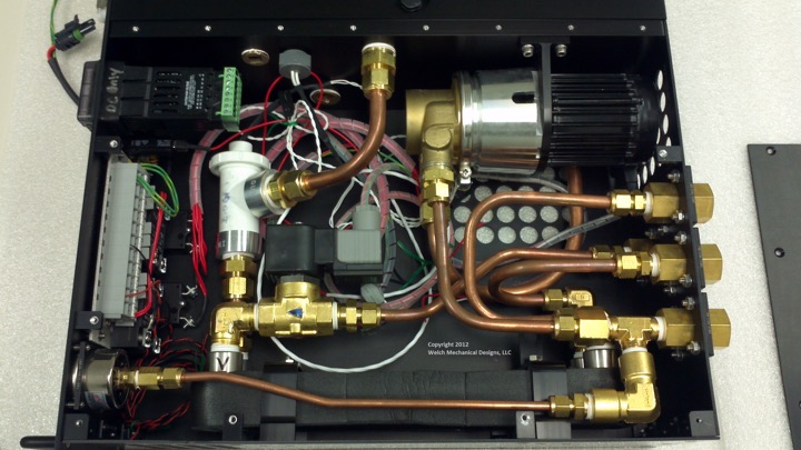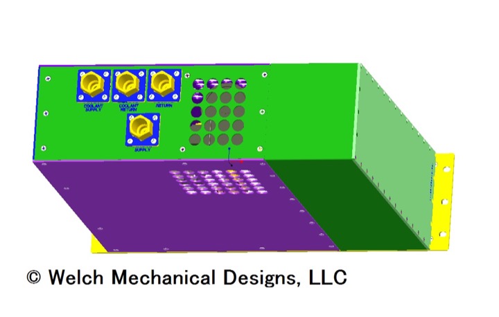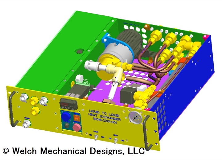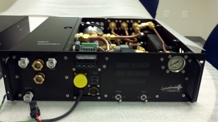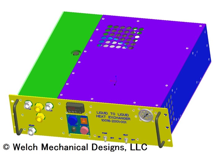 The Liquid-to-Liquid Heat Exchanger consists of a custom-designed coolant reservoir, a water pump, a heat exchanger, a heater, numerous custom bent copper pipes with fittings, PVC pipes and fittings, electronics, switches and gauges, and removable external panels. The custom coolant reservoir is unique in that it serves as a structural component of the box, forming the external shape of one third of the entire rack mounted shape. All of these components are combined into a 17-inch (43.2-cm) X 5.25-inch (13.3-cm) X 17-inch (43.2-cm) enclosure.